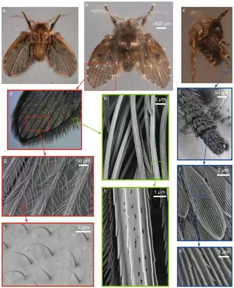 蛾蠓身上有一套神奇的防水系统,秘密就藏在它那满身的绒毛里。蛾蠓体表覆盖的数千根细毛并非装饰,在超高放大倍率的电子显微镜下,这些细毛呈现出精密的构造。每根毛的表面有许多纳米级别的细小沟槽,共同形成了类似荷叶表面的超疏水层。